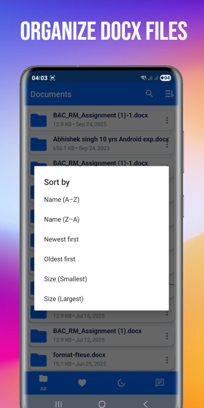All your Word documents (docx/doc) are automatically detected and organized in one place. Search, filter, and access files quickly. Say goodbye to endless scrolling.