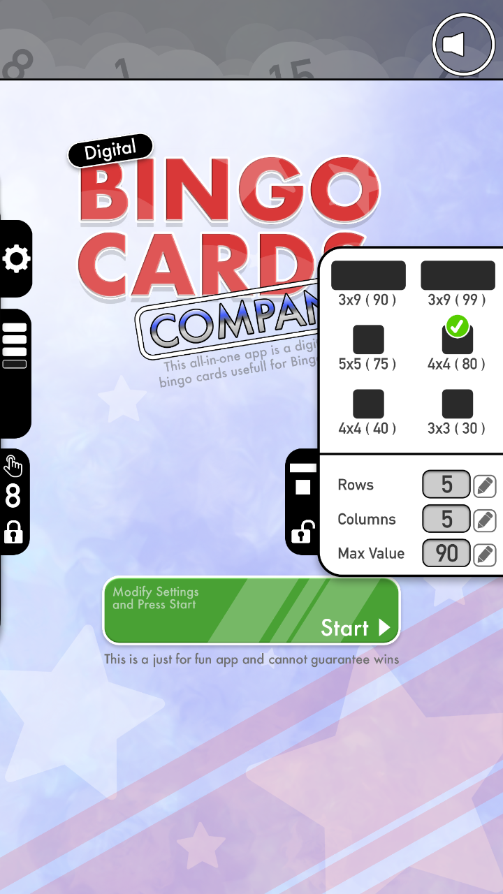 The app also includes a built-in random number generator. It automatically detects the highest number used in your chosen card style and generates valid bingo calls up to that limit. You can optionally have every generated number checked across all cards, allowing fast tracking for solo play or small-group games.