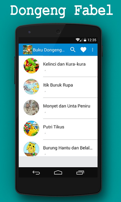 Tale Children's Books Indonesia is divided into eight different categories , namely fairy tale : ★ Popular Tales , ★ Fairy Tale World , ★ Animal Tales / Fables , ★ Tale Muslim Children , ★ Folklore Nusantara , ★ Children Stories Indonesia , ★ The story of the kingdom and ★ Hikayat Abu Nawas . features : ~ Display Material Design ~ 500+ New Fairy Tale ~ Added Menu Favorite ~ Addition Menu Share ~ Size Application only - + 6 MB