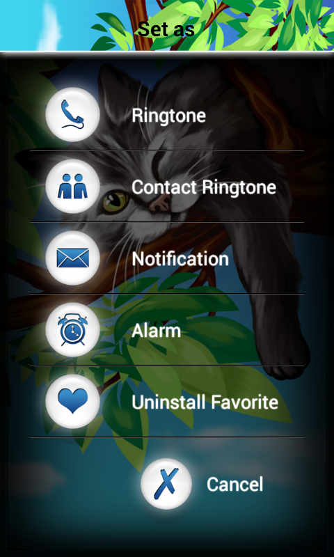 Cat sounds ringtones can be used to make dogs bark, and you can have fun. All cat sounds are real and funny. It is a great app for pet lovers which is suitable and entertaining for both kids and adults. In this cool ringtones app you can find jingle cats sounds, kitty meow and purring. Then many effects of cats crying, cat growling, singing cat and many others. Maybe youÔÇÖve heard xmas dogs and cats, it is here in this free app. Country cat sounds, scary cats, cat call mix tones, meow, a nice kitten sounds and many other moods of cat are included in these sounds. You can use it to play or to set as ringtone , sms or widget for your smartphone. You can have on your phone latest cat party sounds, growling cat, dog and cat xmas ringtones or just classical meow. Listen to sounds of country cat, house cat, mad cat or listen how you can call cat on many different ways. New ringtones, best sounds, hot melodies all of that for free ÔÇô is in here in cats app. A must have ringtones for cat lovers.