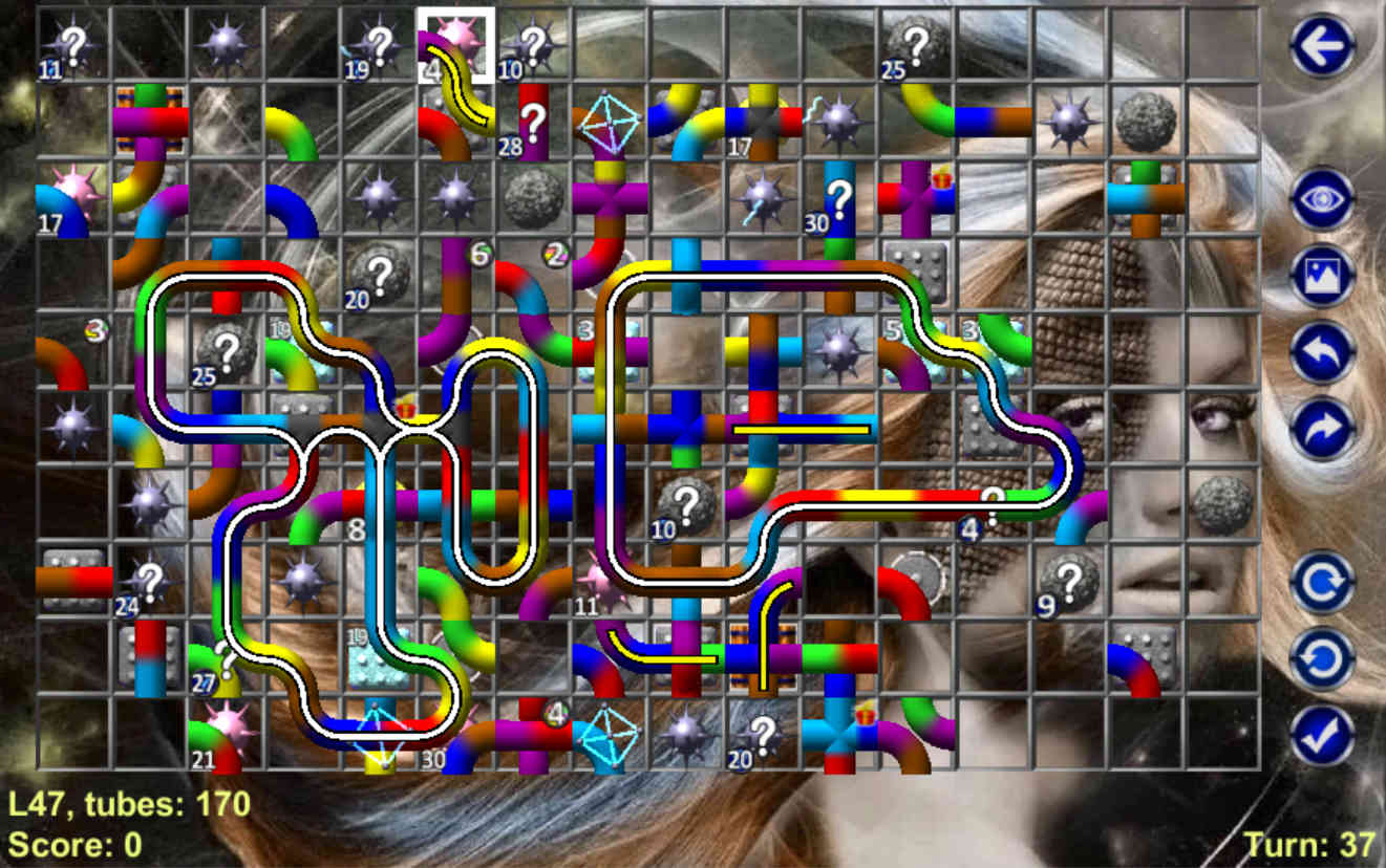 Create closed tube systems to delete them. Match tube end colors. The bigger closed system the more points is given. With difficulty level growth the tube variation is increased, as well as points awarded for tubes deletion. Unlock higher difficulty levels and music tracks. Double tap to rotate tube clockwise.