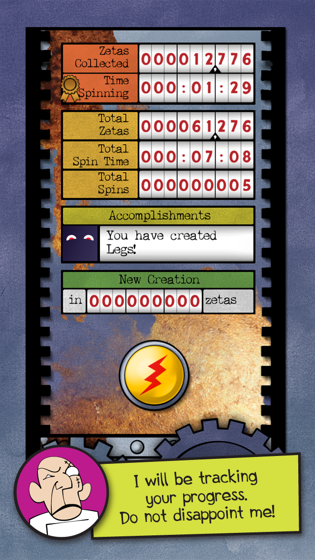 You play as Doctor Spin’s plucky assistant whose chief task is to collect “Zetas” that fuel the sinister creation process. And how do you collect Zetas? YOU SKILLFULLY SPIN YOUR DEVICE! It’s a whole new gaming experience!