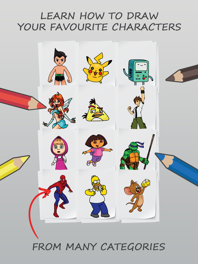 -Choose between 12 different categories with step-by-step illustrations (more than 250, new added daily) ready to be drawn :