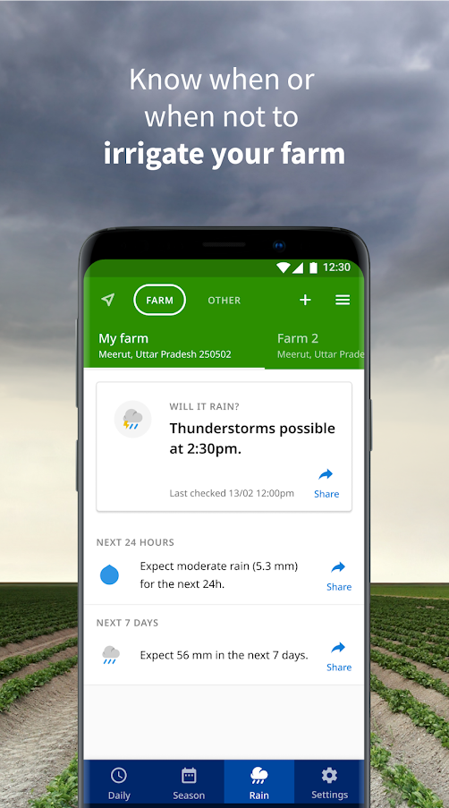 See how likely it is to rain at your farm and share in-app alerts about expected rainfall over the next week with your community.