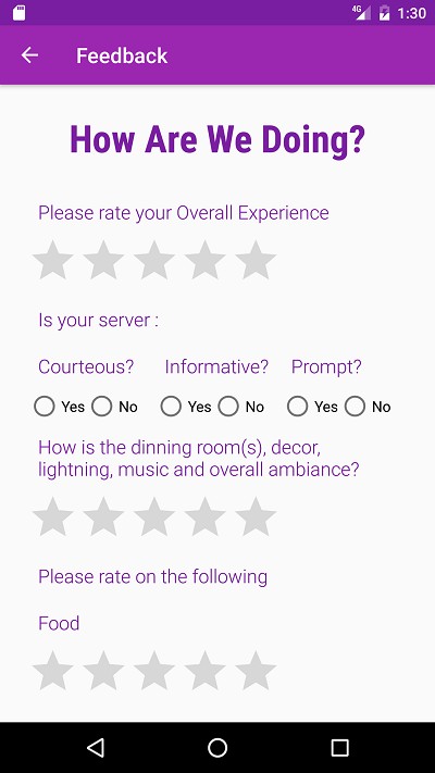 The app is for restaurants and dinning placing. Feedback helps the restaurants manager to monitor the performance instantly, by eliminating the two level data entry process. Once the customer enter the feedback it automatically start showing in the report area of the app.