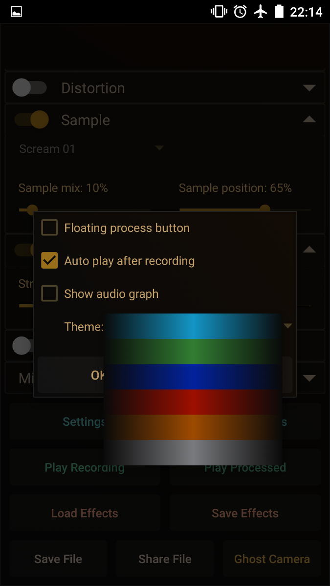 The app has default effects settings which can be changed and saved. You can also display an audio graph for the original recording and the processed file.