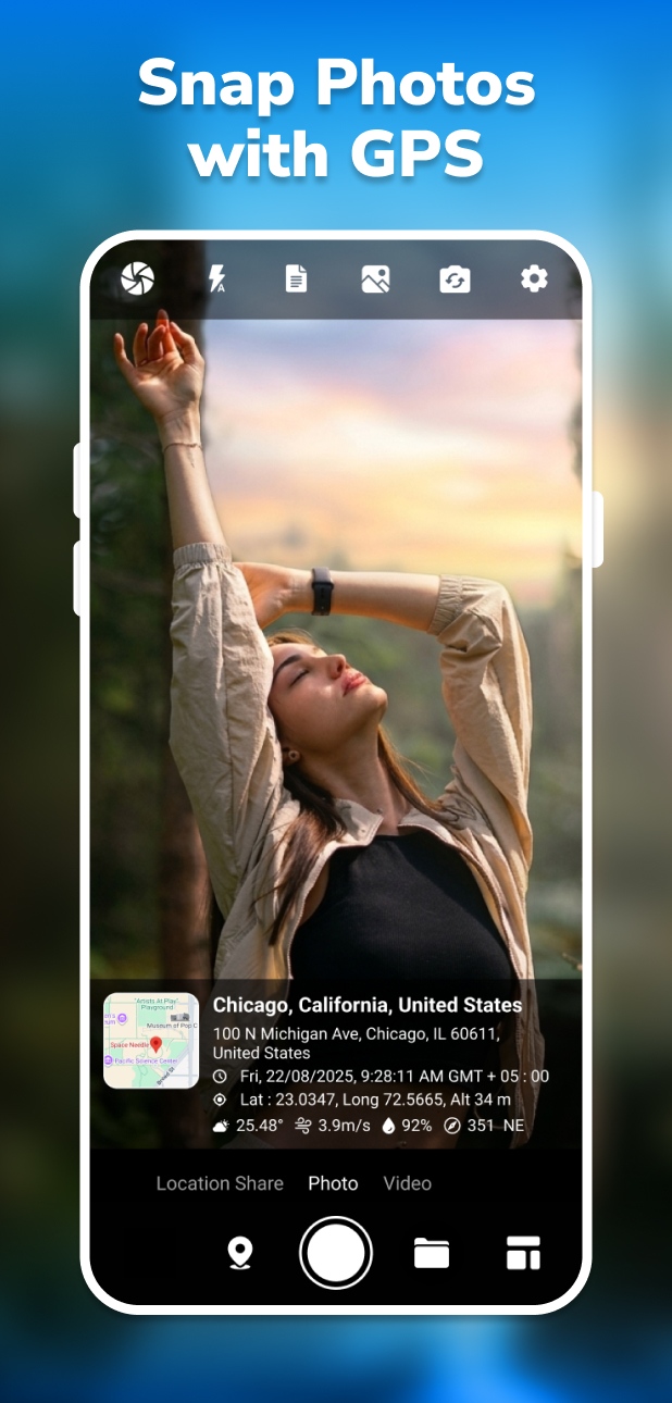 ✓ Add GPS Location Instantly – Automatic geotag photos with real-time coordinates.