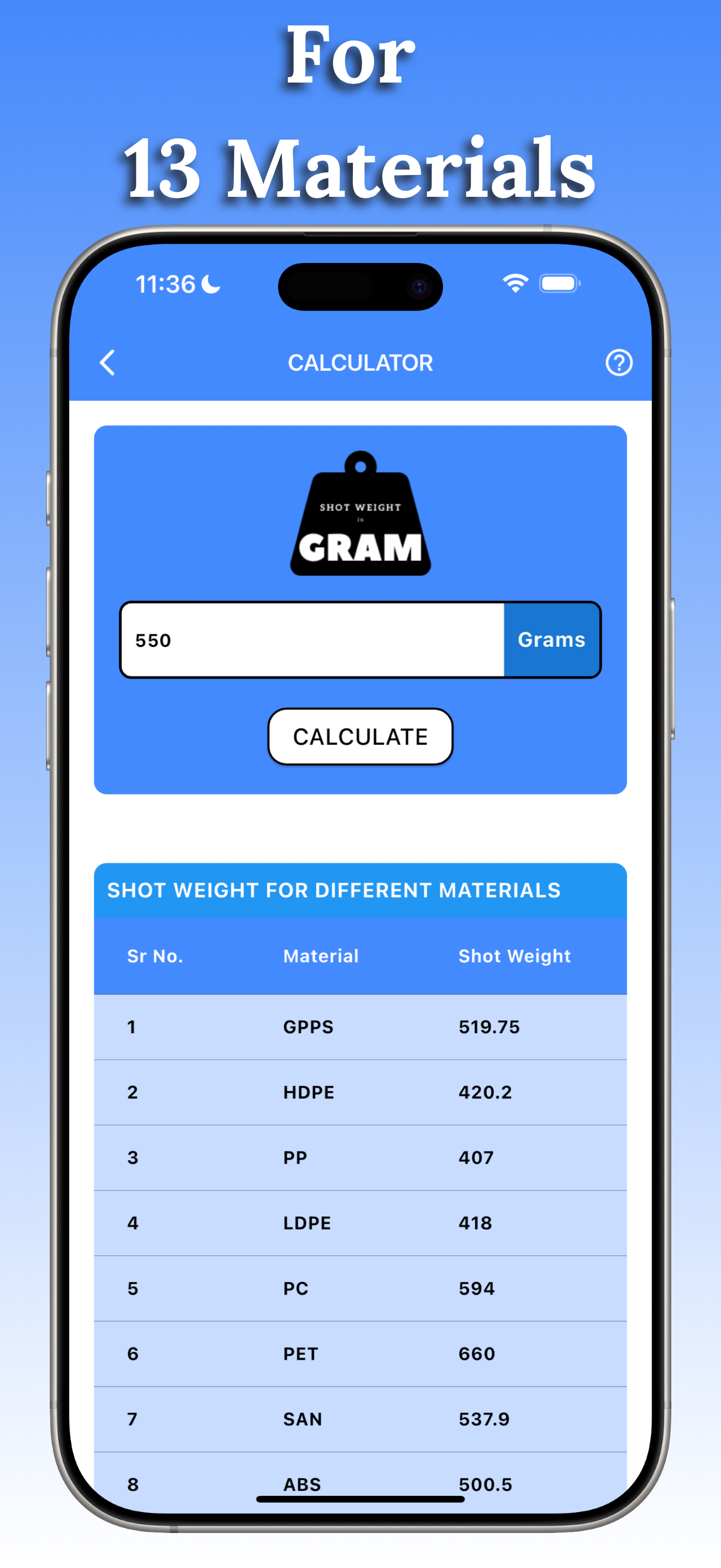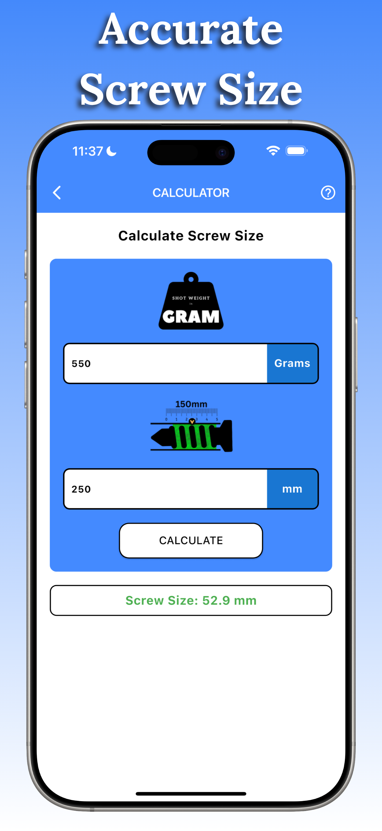 Whether you’re estimating material shot weight, determining screw size, or calculating clamping force — this app brings every essential tool into one easy interface.