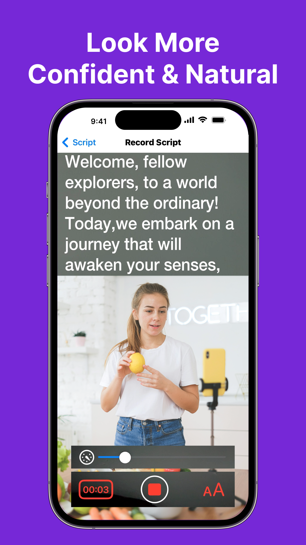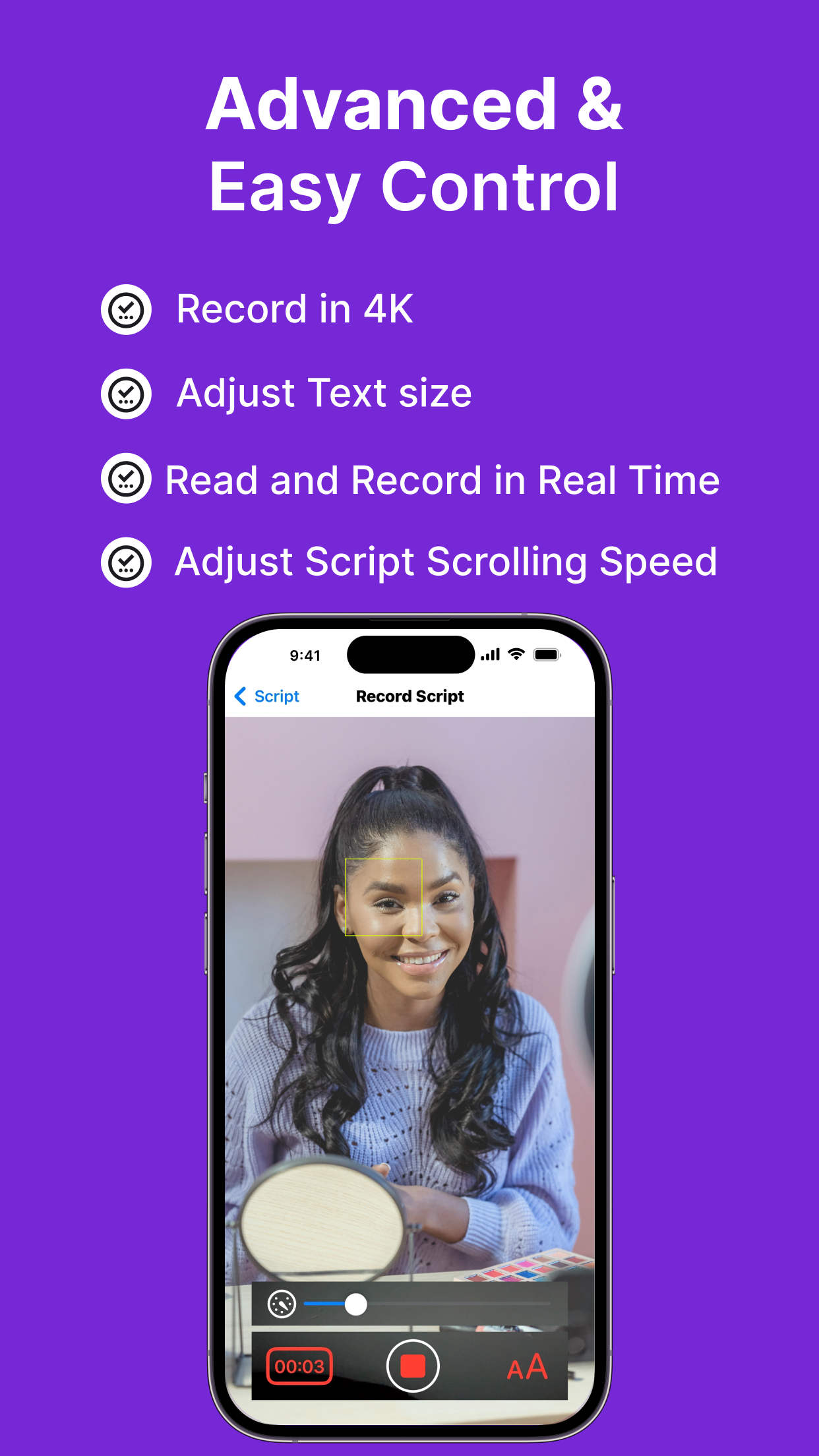 The app has custom controls allowing you to start and stop the video recording as well as control the auto scrolling Script (start / pause / resume / adjust speed).