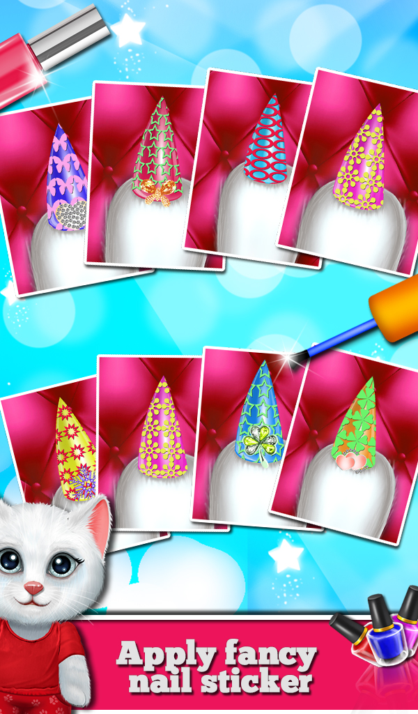 Welcome to the Kitty Fancy Nail Salon game. Help this little kitty and create super cute nail polish art. Let your designer creativity flow with this kitty nail salon and design the most beautiful nails ever.