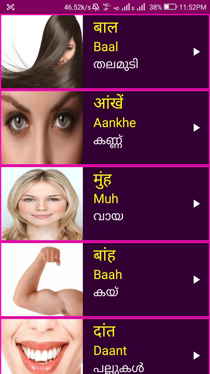 1. Each hindi word has clear image and audio pronounciation to make Learning hindi from Malayalam Easy. Every hindi word has Malayalam meaning.