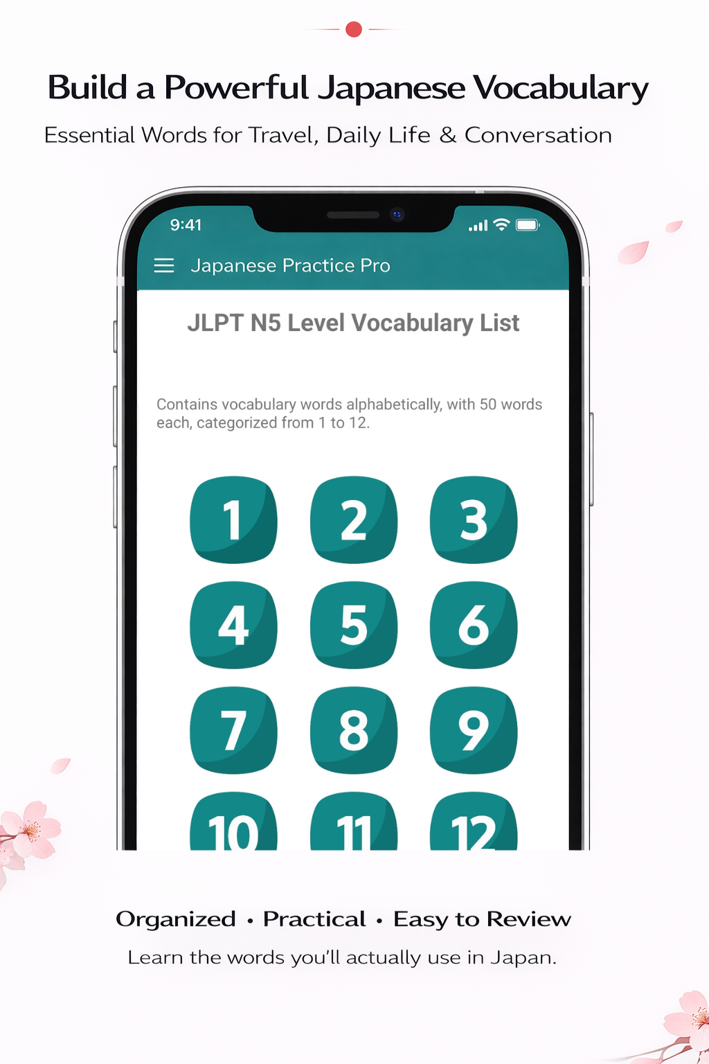 Curated Vocabulary: 600+ high-frequency words designed for daily life and N5 exam prep.