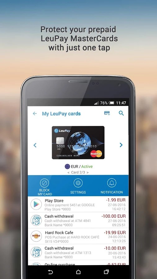 Users can always access the online platform by visiting: https://www.leupay.eu/ or download the latest version of the mobile app for Android, iOS, and Windows devices (Android/ iPhone/ Windows phone)