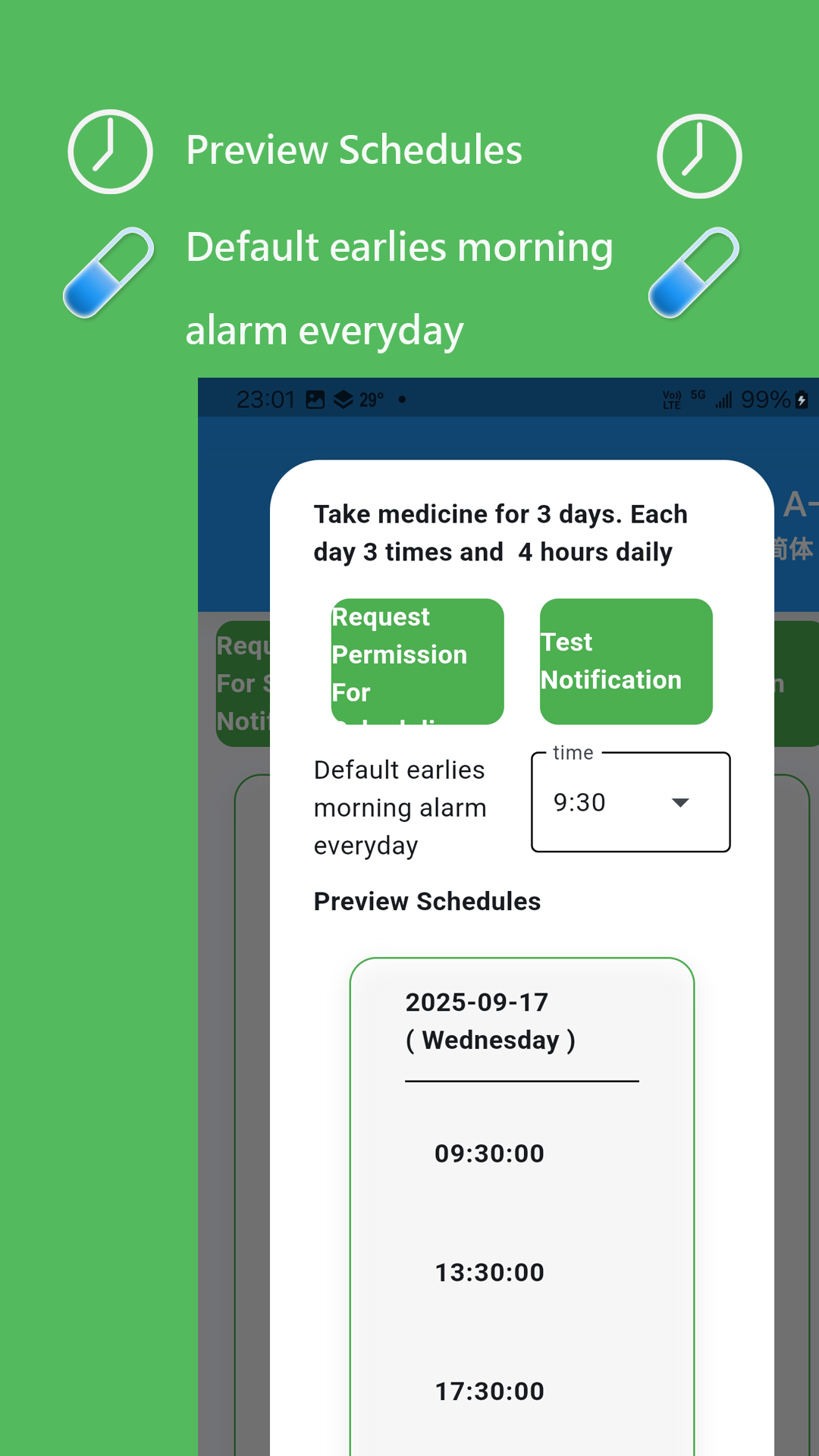 Waring Tip: In order to ensure alarm and notification work property, please press "Test on Notification" button before creating schedule(s).