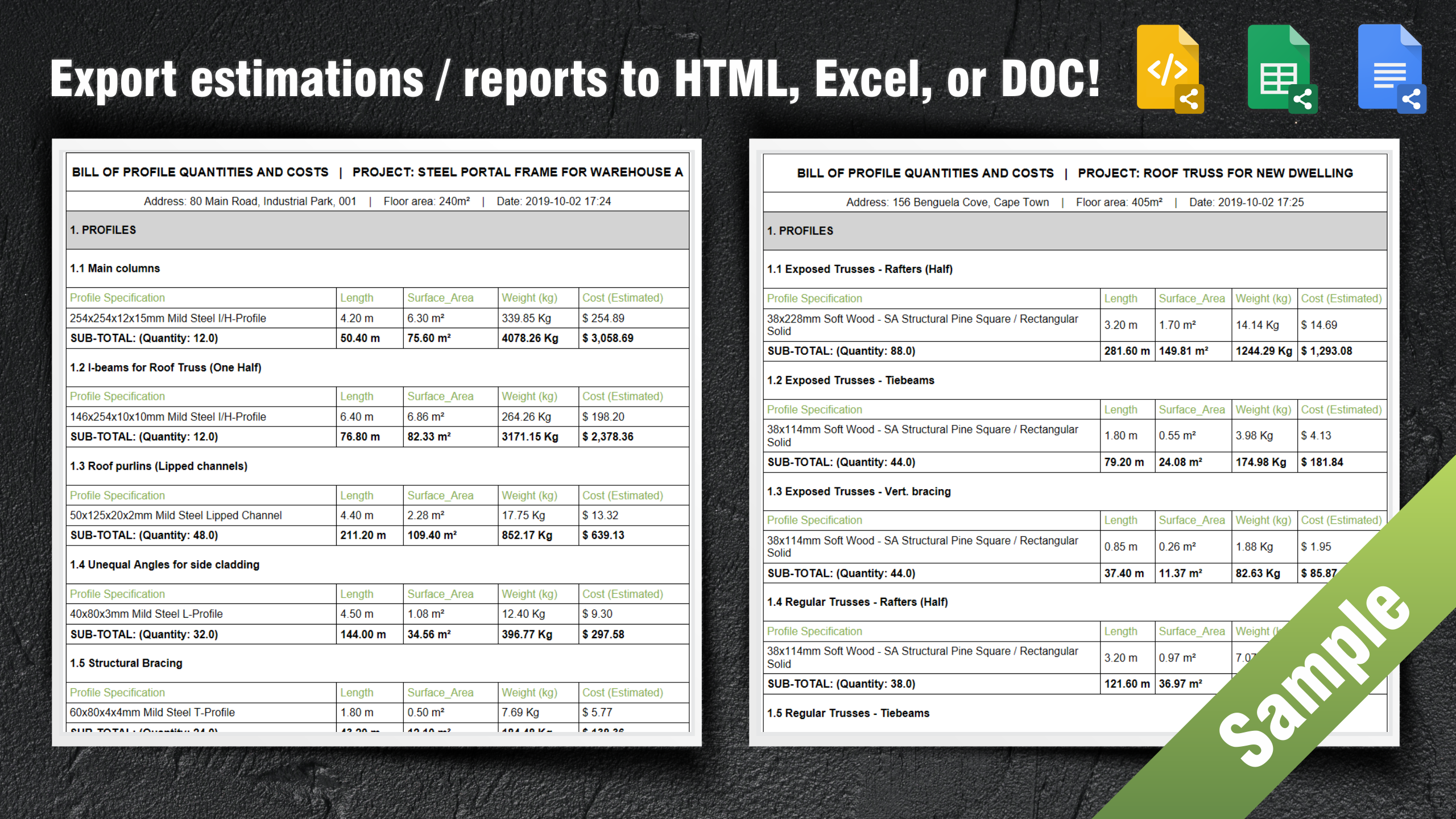 ProfileCALC is a professional, easy-to-use profile weight, surface area & cost estimation system designed for use by engineers, contractors, structure designers, quantity surveyors. The app allows you to quickly create estimations, calculations & reports for steel or wood frame structures. It can also be used to calculate the materials for roof trusses, portal frames, columns, beams, gates, fences, carports, balustrades and lots more!
