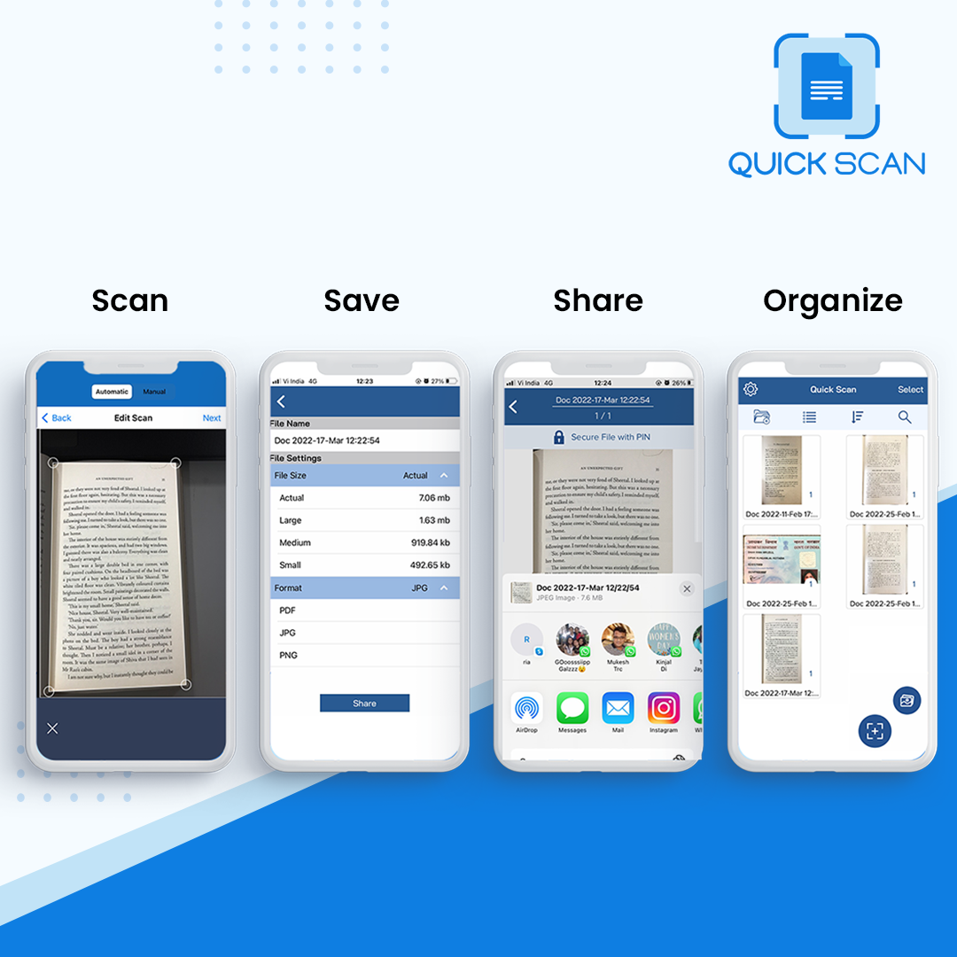 The latest addition of Technostacks QuickScan document scanner app comes with seamless text recognition and extraction. This means that companies can scan , edit , and share documents immediately, without any setbacks or rigidity.The process of digitising documents with OCR is very simple. Users snap a photo of the document using an OCR application, and the application will detect and then digitise the image and the text that is contained in it. The digital document can be edited, marked up and then shared.
