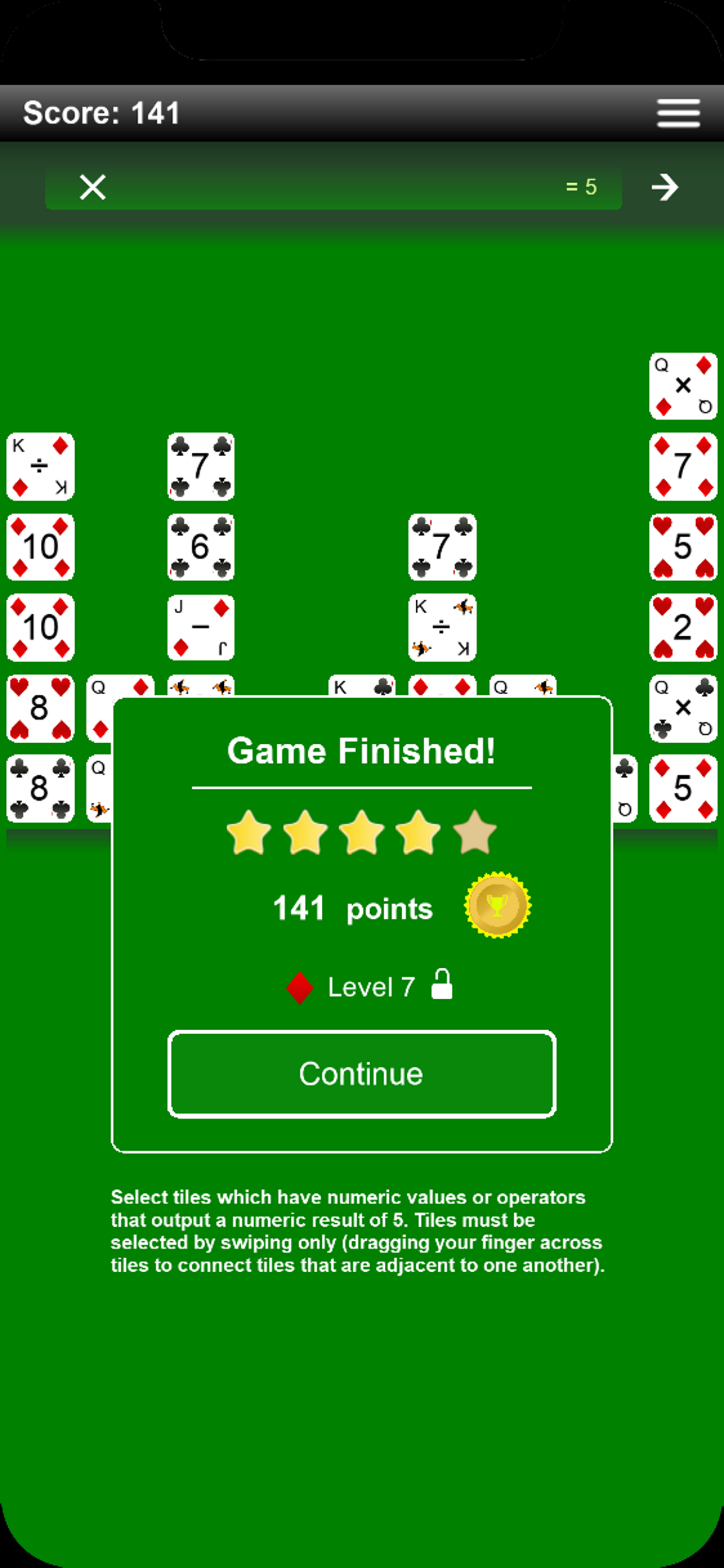 Swipe or tap tiles in a tile grid to form math equations that equal a specified number. Each tile is associated with a number or operator and a suit (diamonds, clubs, hearts, spades, or wild). Cards drawn from a deck determine the specified math result and other criteria for math submissions. For example, in addition to producing a math result of 2, the tiles submitted for a particular card may need to be all of the hearts suit, contain at least one multiplication operator, or be submitted by swiping only. Cards become earned after submitting all of the math results for the given card. Earn all of the cards in the deck to win the game!