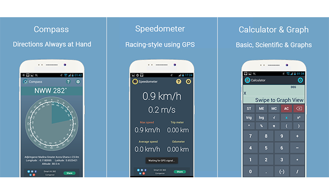 Tools support both metric and imperial unit formats and several languages. However, not all devices have the appropriate sensors to support all the tools. Please note that Smart Kit 360 is a free app supported with unobtrusive banner ads only.
