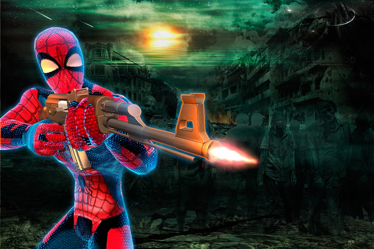 Save the city attacked by the dead monster zombies in Super Spider Zombie Battle game. Rescue people in this final battle as a spider hero. Destroy apocalypse of zombies, save the city defeat the supervillain with shooting action! Dark force and good force will fight with each other for the fate of Universe. You will fight like a strange hero of the city in this future battle. Use all your fantastic futuristic powers and marvelous strategy to fight, protect and rescue the people and the universe in this war hero game like a super spider. Start the mortal battle against the virus of dead zombies & extraterrestrials. Play like spider army and become the strange war hero. Your super spider hero with super powers & skills are strange you need to continue performing your duty & serving your grand city as a super spider army in this war & battle situation like hero. Test your flying skills as save the people against the zombies in Super Spider Zombie Battle! Spider vs zombies game.