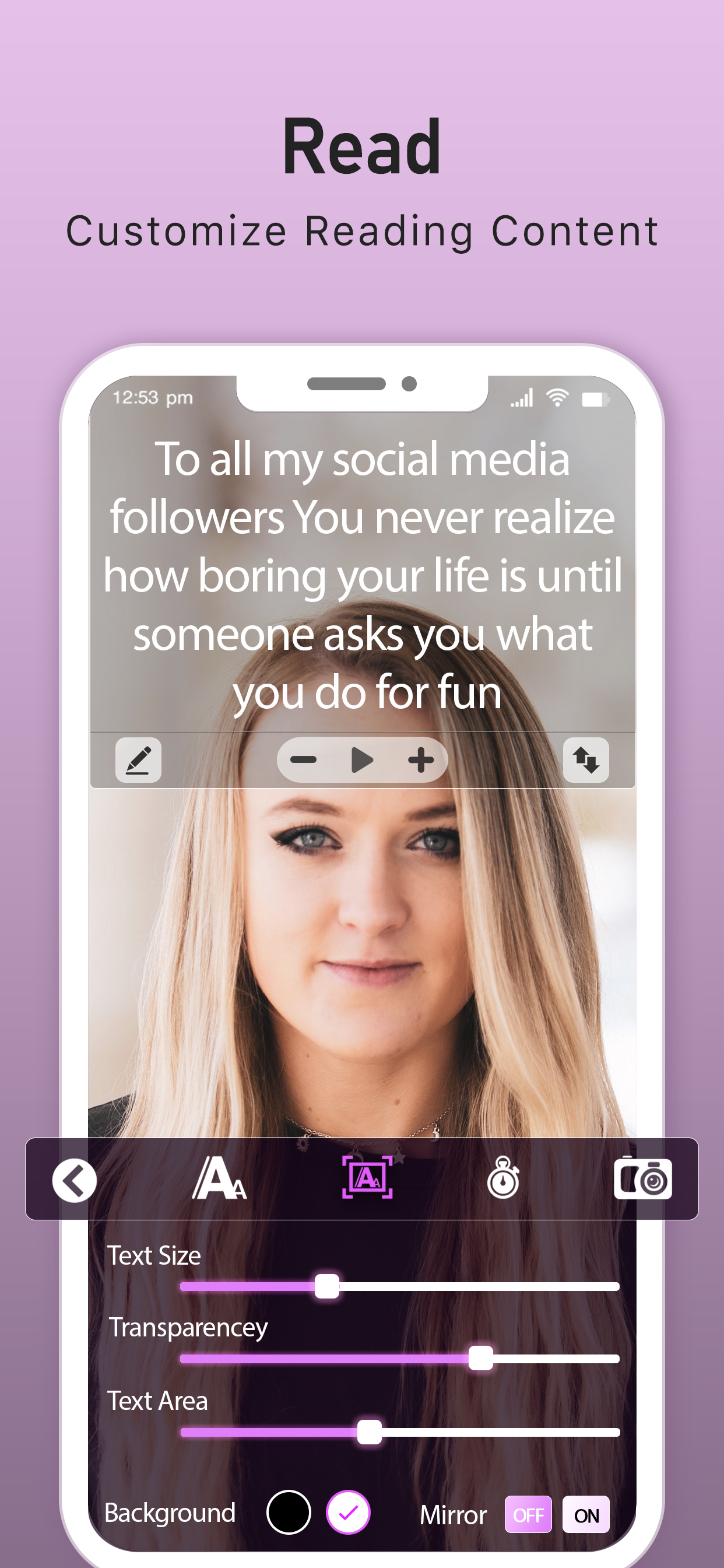• Teleprompter can adjust size and colour of the script and transparency of the text area.
