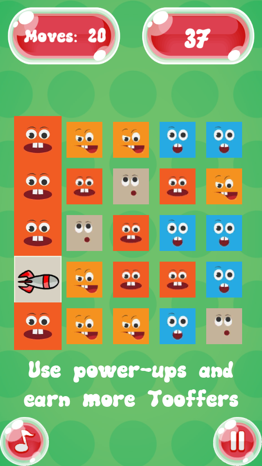 - Connect more than 5 Tooffers in one shot to earn missiles , 7 for Bombs and more to get extra moves.