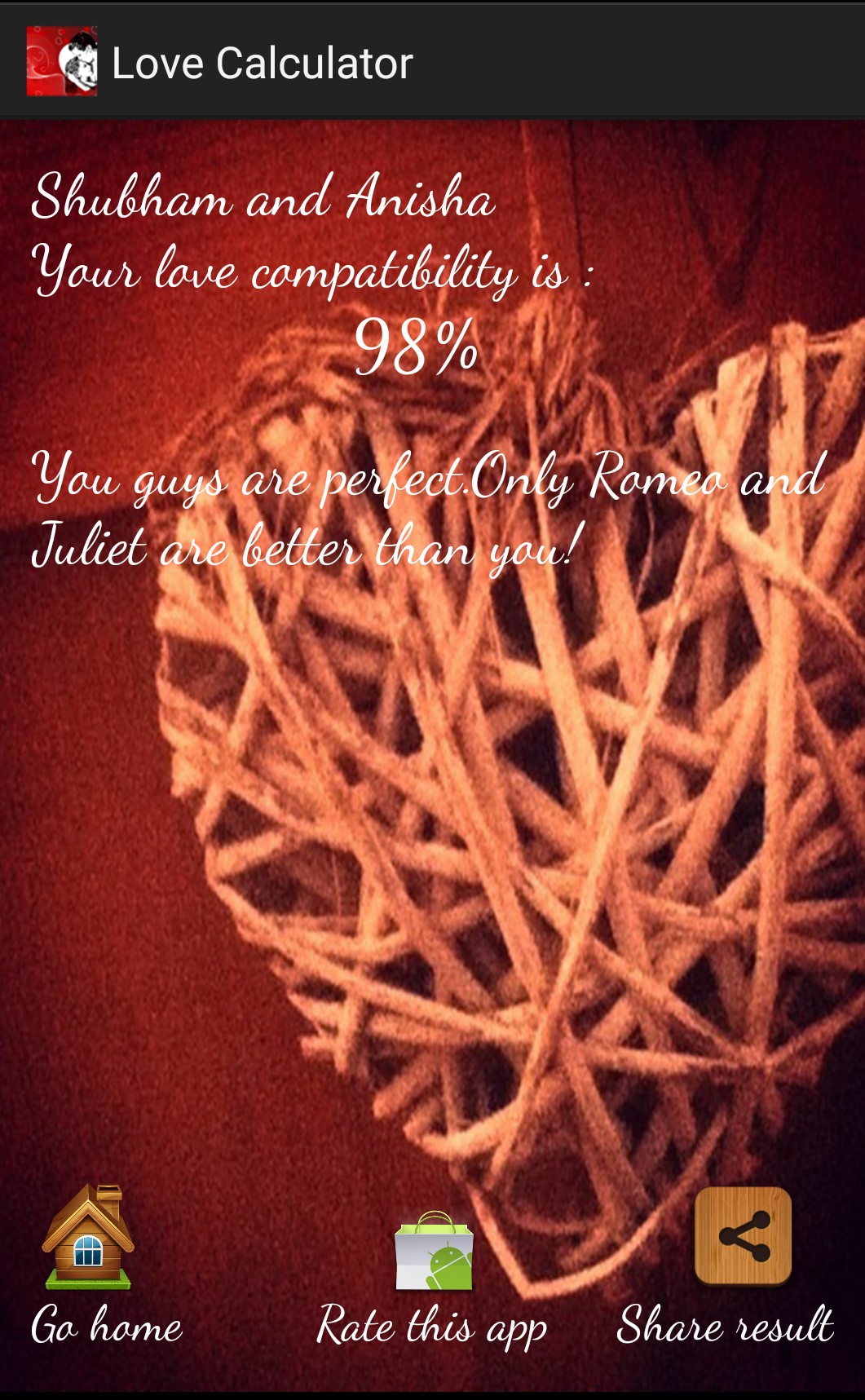 Love calculator is a real compatibility(relationship) tester with your valentine(crush).If your love is true and holds a future ahead together, the love calculator will rekindle not only the flame in your heart but also be a positive sign in your love life.