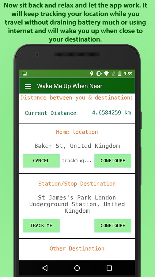 The app has a cute innovative trick to make sure you wake up at your destination. A little cute app to help out everyone who has faced this situation before. Especially after late night parties :) This charming app will wake you up by playing an alarm tone when you are about to home on Train/Tube/Bus so that you don't miss your stop and end up at the last stop of your route.