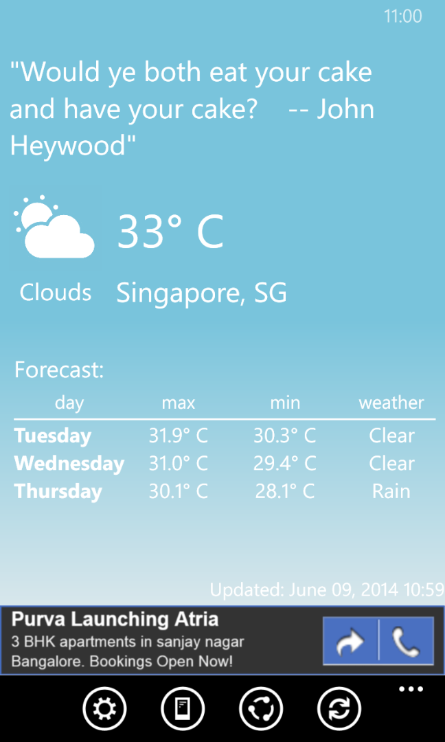 It quotes the current weather with a quote from selected categories. The app follows Microsoft's modern design guidelines combined with support for phone theme. It provides transparent live tile and live lockscreen background with latest weather and a quote.