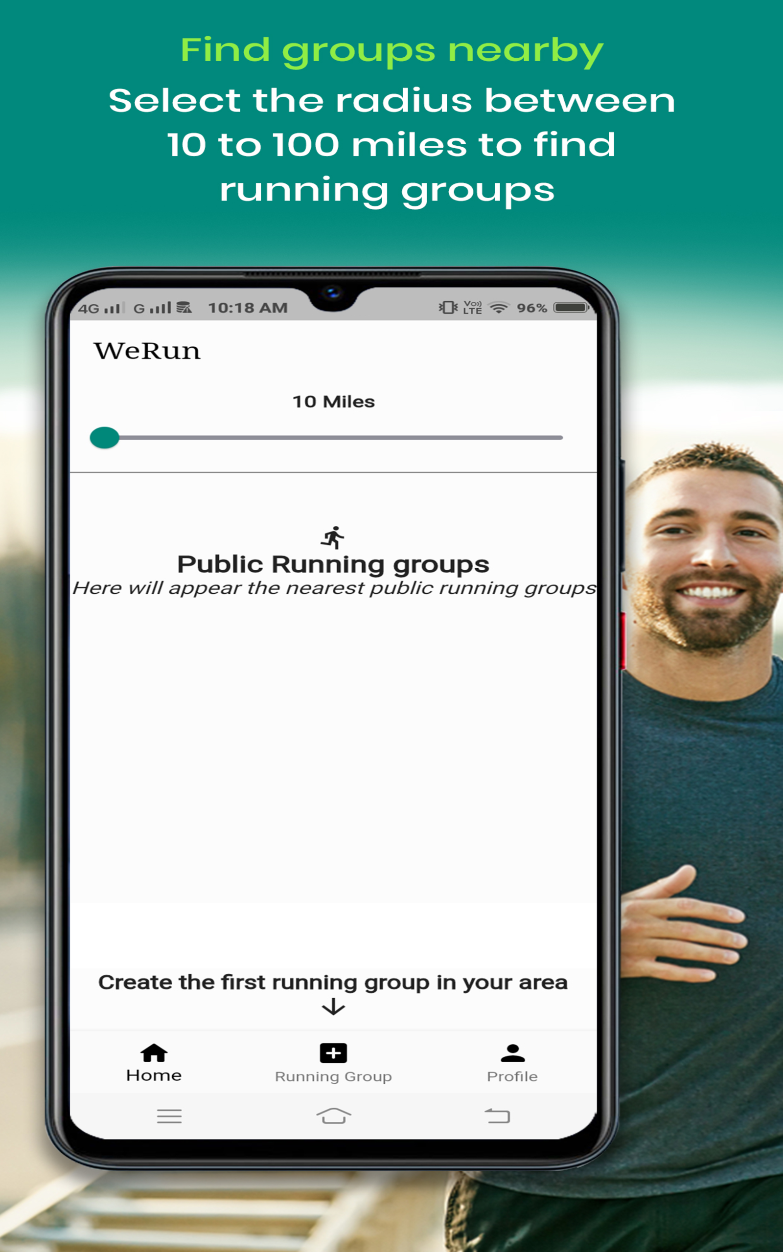 ⦁ Find groups nearby- You can find public running groups in your area by selecting the desired radius. Note that the default radius is 10 miles and you can go up to a hundred miles.