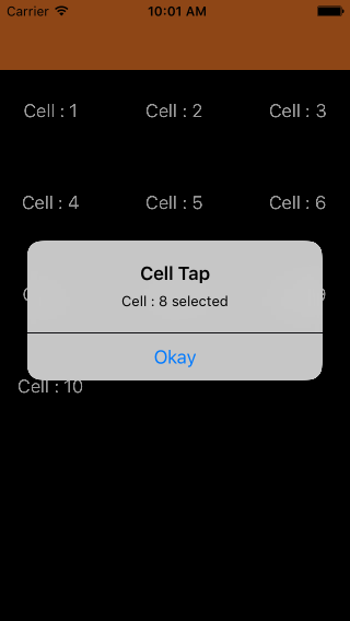 Here, we display alert message for each tap on UICollectionViewCell. If you tap on “Cell : 8” than it’s display alert like:
